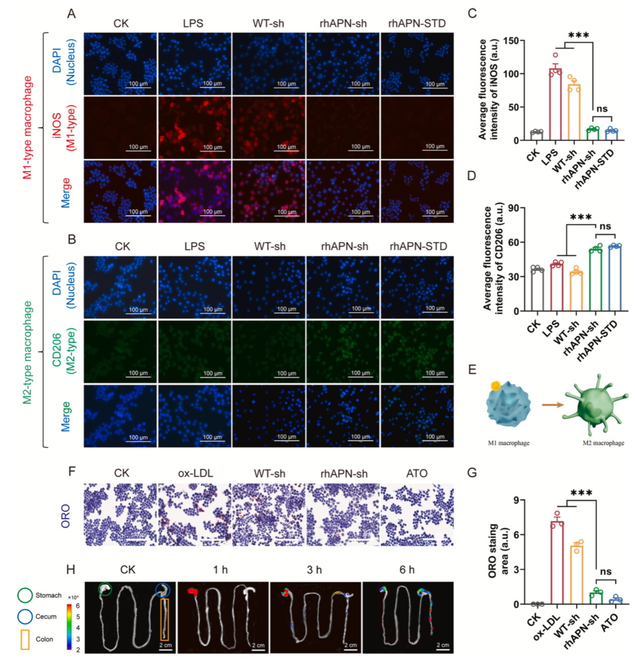 图3. rhAPN-sh的体外抗炎活性及生物分布研究。巨噬细胞中iNOS (A)和CD206 (B)的免疫荧光。标尺=100 μm。用Image J软件定量(C) iNOS和(D) CD206的荧光强度。数据以mean±S.E.M.表示(n = 4;*p <0.05, **p <0.01, ***p <0.001)。(E) rhapn -sh诱导的巨噬细胞表型极化。(F) ox- ldl诱导的Raw上rhAPN-sh的图像264.7巨噬细胞。(G)使用Image J软件对Oil Red O染色区域进行定量。标尺=50 μm。(H) rhAPN-sh的生物分布,小鼠灌胃给药cy7标记的rhAPN-sh,并在不同时间点(1,3,6 h)获得GIT的荧光图像。比例尺=2厘米。数据是以mean±S.E.M.表示(n = 3;*p < 0.05, **p < 0.01, ***p < 0.001)。