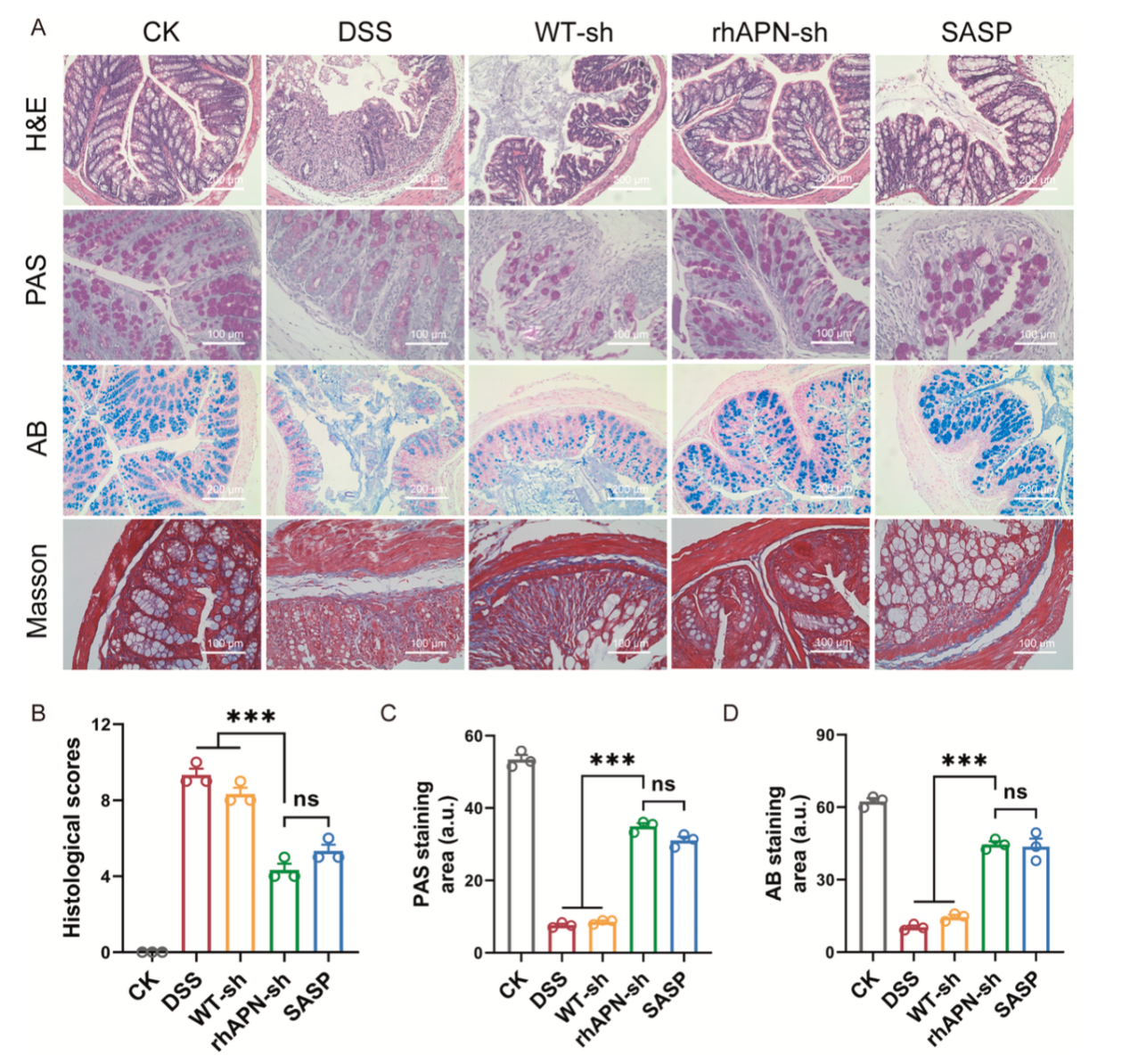 图4. 小鼠结肠病理切片分析。(A)各组H&E、PAS、AB和Masson染色结肠切片。比例尺=200 μm(H&E)。比例尺=100 μm (PAS)。比例尺=200 μm (AB)。比例尺=100 μm (Masson)。(B) H&E染色,(C) PAS染色,(D) AB染色组使用Image J软件。数据以平均值±S.E.M.表示(n = 3;*p < 0.05, **p < 0.01, ***p < 0.001)。