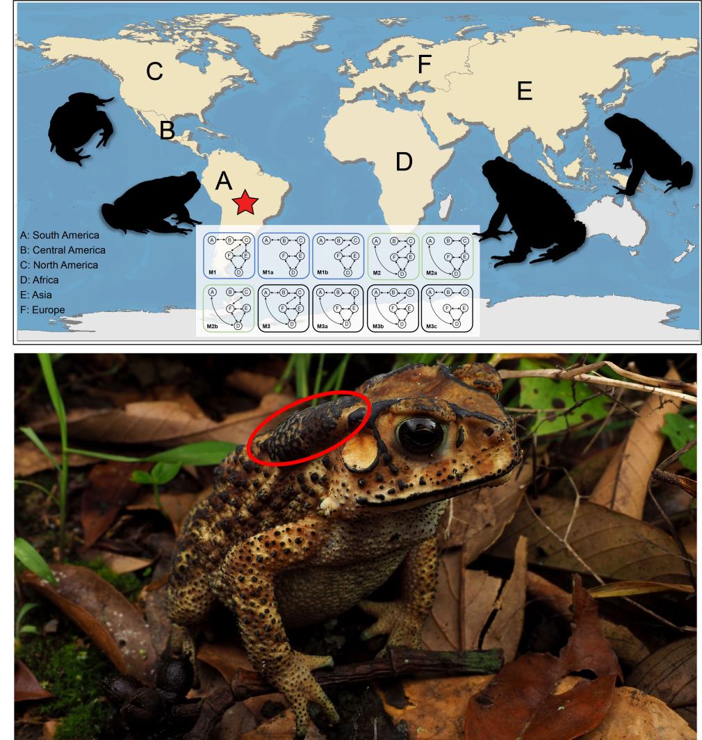 图1 上图为蟾蜍六个主要生物地理分布区。南美洲(A)、中美洲(B)、北美洲(C)、非洲(D)、亚洲(E)和欧洲(F)。红色五角星标示了蟾蜍科在南美洲的起源位置。下图为黑眶蟾蜍(Duttaphrynus melanostictus)物种照片,红色圆圈为耳后腺体。