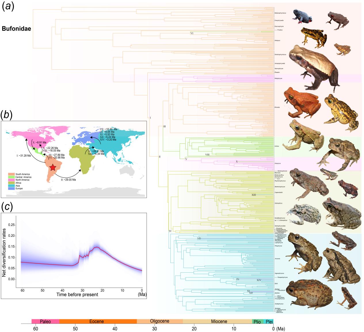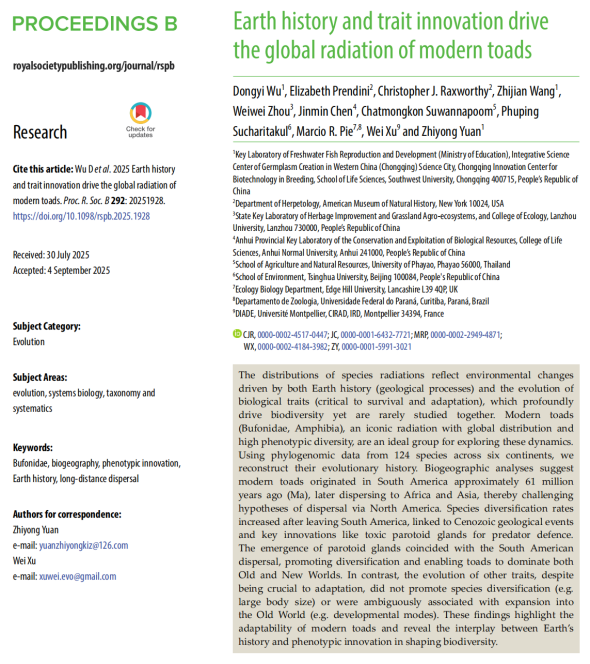 2025年10月,西部(重庆)科学城种质创制大科学中心袁智勇教授团队联合多国学者在Proceedings of the Royal Society B发表了题为“Earth history and trait innovation drive the global radiation of modern toads”的研究论文。该研究系统揭示了蟾蜍如何在地球历史演化(板块运动、气候变化)与耳后腺(毒腺、防御)和脂肪体(能量、代谢)等关键性状创新的协同作用下,从南美洲起源并实现全球分布,为理解不同大陆间生物的演化过程及其变化规律提供了重要的新视角。该研究获《Science》杂志专题报道(https://www.science.org/content/article/poisonous-sacs-helped-toads-conquer-world)。