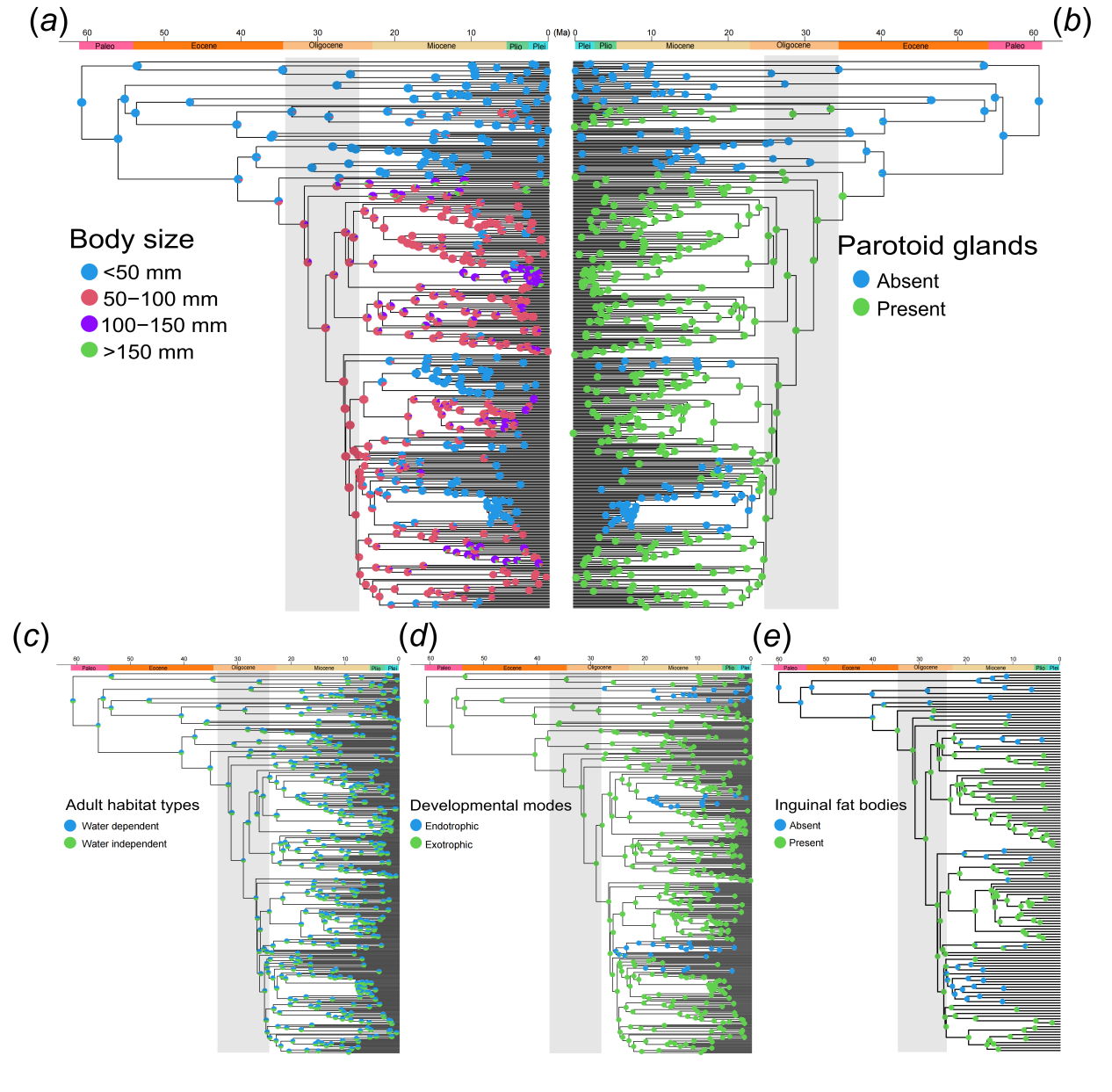 图3 现代蟾蜍的性状祖先状态重建。(a) 体型。(b) 耳后腺。(c) 成体栖息类型。(d) 发育方式。(e) 脂肪体。