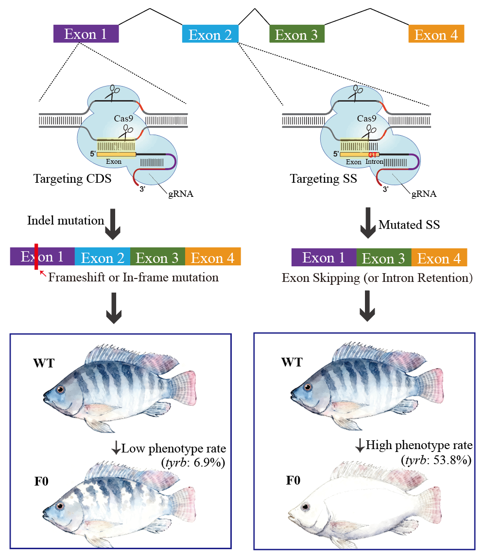 研究发现,传统CRISPR/Cas9在靶向编码区时,常因非移码突变的存在导致敲除效果不佳。而团队设计的剪接位点靶向策略,通过在内含子-外显子交界处引入突变,使基因转录产物发生异常剪接,从而实现更高效的基因功能丧失。在罗非鱼模型中,该策略相较传统策略有效突变率和表型率在F0代大幅度提高,且有30%的个体获得接近纯合突变的表型。