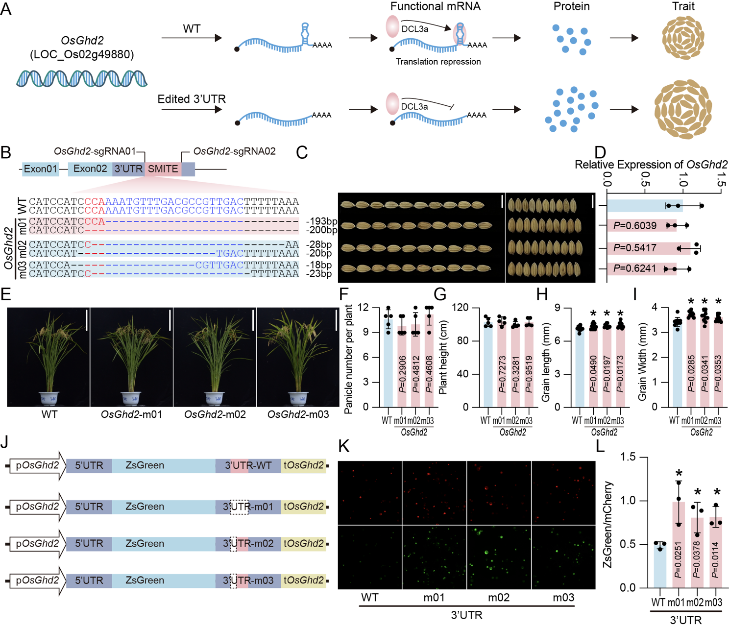 除miRNA外,研究者进一步应用MND-Cas9 V2对OsGhd2基因3’ UTR中的SMITE调控元件(研究表明:SMITE元件通过在OsGhd2基因3’ UTR形成特定的茎环结构来抑制其蛋白质翻译)进行了精准编辑。研究者采用单sgRNA局部破坏和双sgRNA大片段删除两种策略,获得了一系列OsGhd2基因3’ UTR序列发生重构的编辑突变体。实验结果显示,这些突变并未改变其mRNA水平,但双荧光报告系统验证发现,SMITE元件的缺失显著解除了翻译抑制,从而增加了蛋白积累。最终,编辑株系粒长和粒宽明显增加,为应用编辑非编码调控元件来创制数量性状变异提供了进一步典型范例。