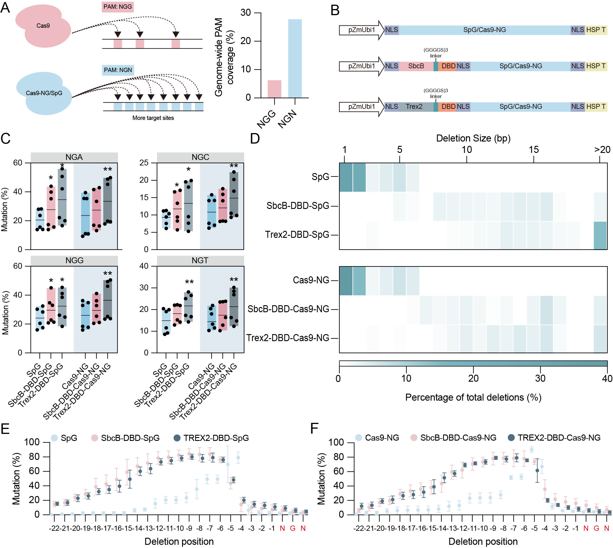 近日,西部(重庆)科学城种质创制大科学中心张勇教授课题组在Journal of Integrative Plant Biology(JIPB)期刊上,发表了题为“Enhanced exonuclease-Cas9 systems promote multiple nucleotide deletions with higher efficiency and broader targeting scope in plants”的研究论文。该研究通过引入多类型外切核酸酶及单链DNA结合结构域(DBD),成功开发了一系列多碱基删除Cas9系统(Multiple Nucleotide Deletion-Cas9, MND-Cas9),显著提升了植物基因组多碱基删除的效率和范围,为植物基因组非蛋白编码DNA区域功能解析及分子育种提供了有力工具。全文研究工作概述如下: