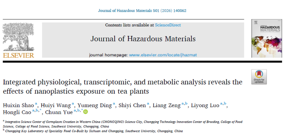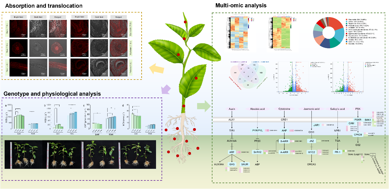 近日,西部(重庆)科学城种质创制大科学中心茶树团队在Journal of Hazardous Materials在线发表最新研究论文:Integrated physiological, transcriptomic, and metabolic analysis reveals the effects of nanoplastics exposure on tea plants。该研究首次系统探讨了纳米级聚苯乙烯(PS-NPs)暴露对茶树生长的影响及其内在生理与分子机制。通过水培实验,结合生理指标测定、扫描电镜(SEM)、激光共聚焦显微镜(LSCM)、转录组学和代谢组学等多维度分析手段,揭示了PS-NPs在茶树体内的吸收、转运规律及其引发的系列响应。研究发现,50纳米粒径的PS-NPs能被茶树根系吸收,并通过维管系统向上运输,在茎、叶柄乃至嫩芽等代谢活跃的组织中积累,且呈现浓度依赖性。