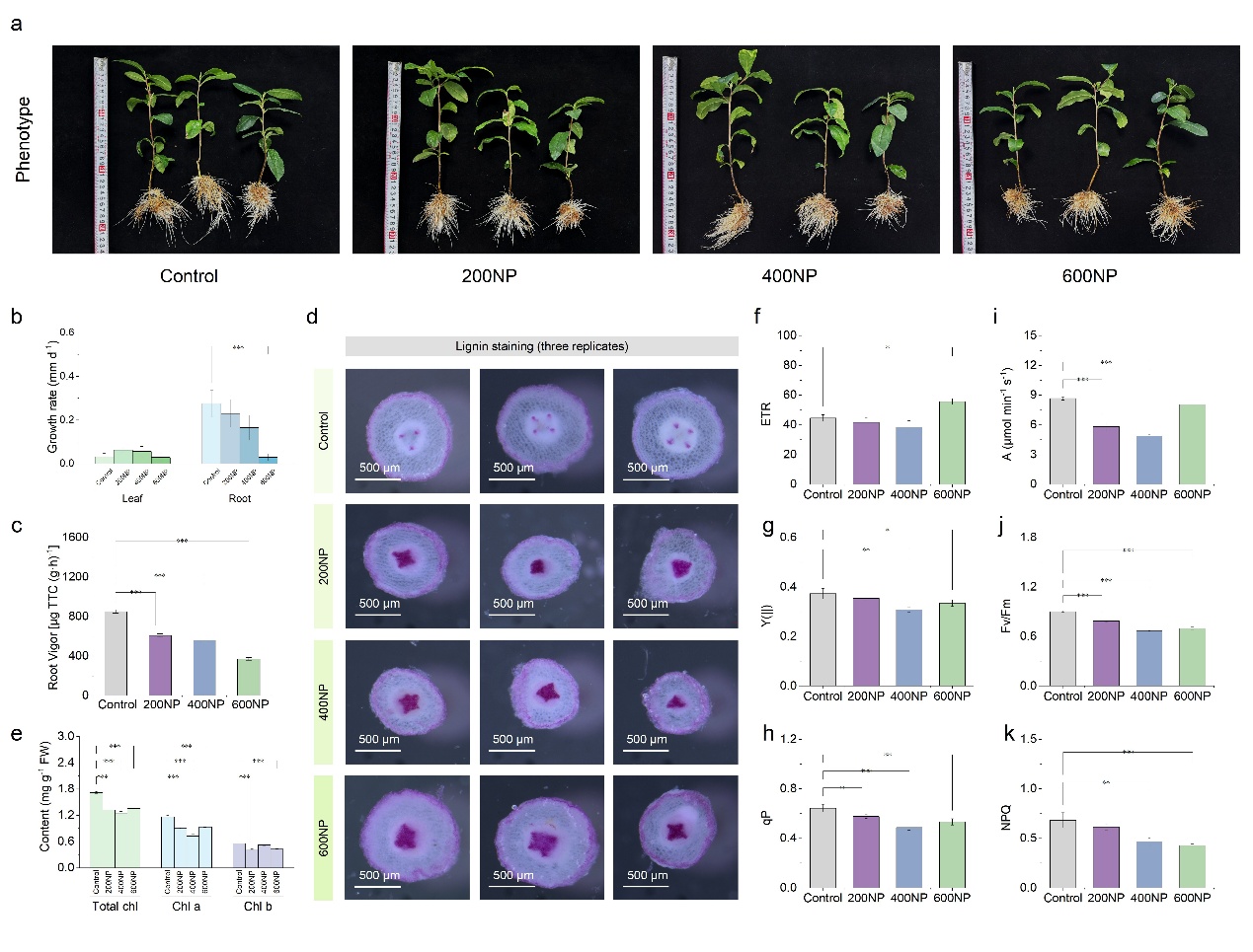 研究发现, PS-NPs暴露下,茶树根系伸长受抑制、根系活力下降,以及根皮层和中柱木质化程度显著增强。地上部则在高浓度(400和600 mg/L)PS-NPs处理下出现叶片黄化、萎蔫现象。PS-NPs暴露抑制叶片光合作用,如叶绿素a和b含量降低,光系统II的最大光化学效率(Fv/Fm)、表观电子传递速率(ETR)、光化学猝灭系数(qP)等关键光合参数下降。虽然气孔形态(如孔径、密度)未发生显著变化,但气孔导度(Gs)和蒸腾速率(E)均降低,暗示PS-NPs可能在维管系统造成堵塞,影响水分运输。PS-NPs暴露诱导了活性氧(ROS)的积累,触发了茶树的氧化应激响应,抗氧化酶系统(如超氧化物歧化酶SOD、过氧化物酶POD)活性发生改变,非酶抗氧化剂还原型谷胱甘肽(GSH)含量显著上升。