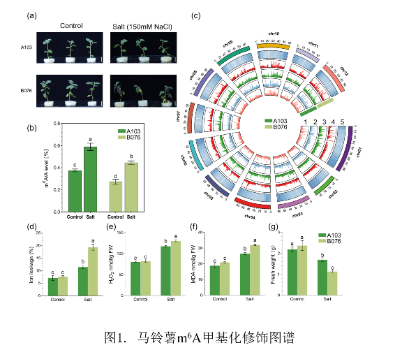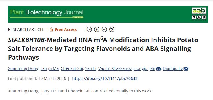 近日,西部(重庆)科学城种质创制大科学中心吕典秋课题组在植物学领域国际知名期刊《Plant Biotechnology Journal》上发表题为“StALKBH10B-mediated RNA m6A modification inhibits potato salt tolerance by targeting flavonoids and ABA signaling pathways”的研究论文。该研究首次在全转录组水平解析了m6A甲基化修饰调控马铃薯耐盐性的分子机制,阐明了StALKBH10B通过协同调控ABA信号和类黄酮合成两条关键通路影响盐胁迫应答的分子网络,为深入理解马铃薯耐盐性的表观调控机制提供了新见解,也为耐盐马铃薯种质创新提供了新的分子靶点和育种策略。